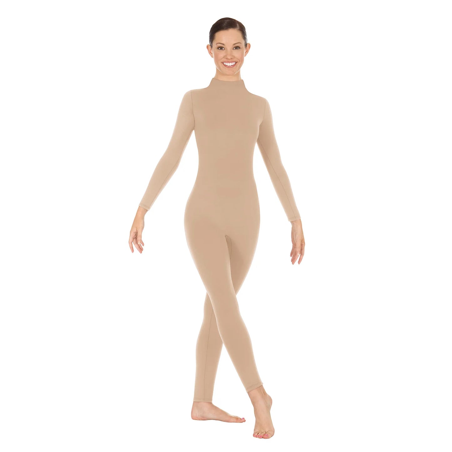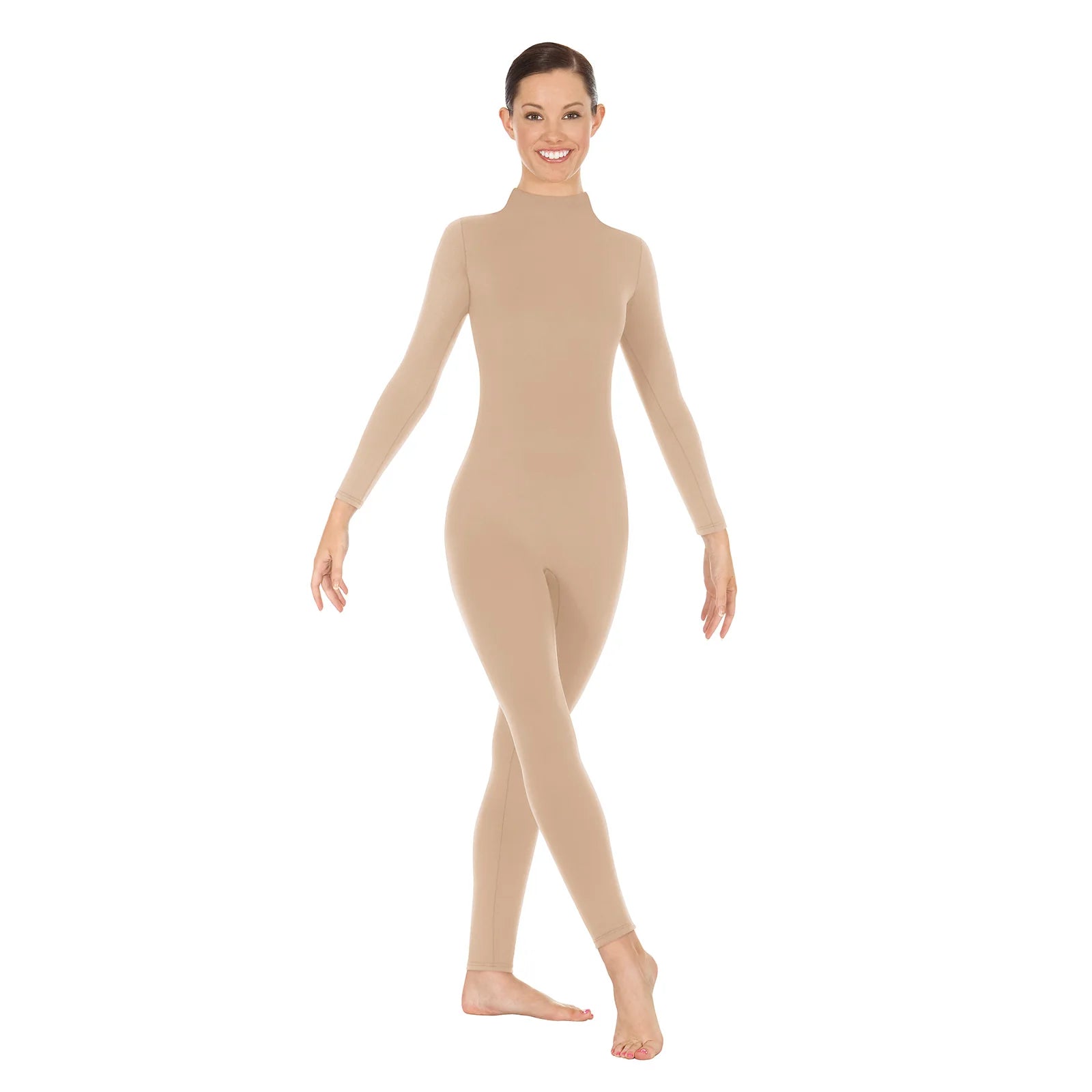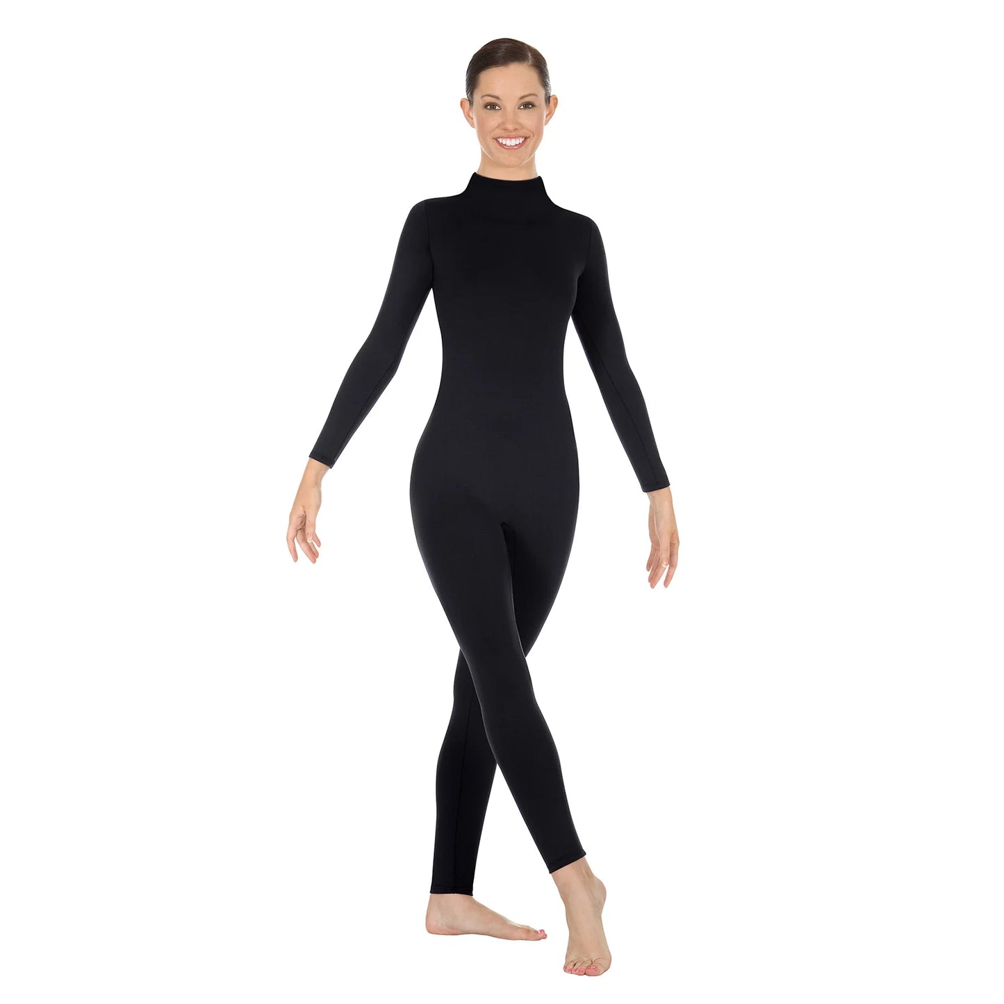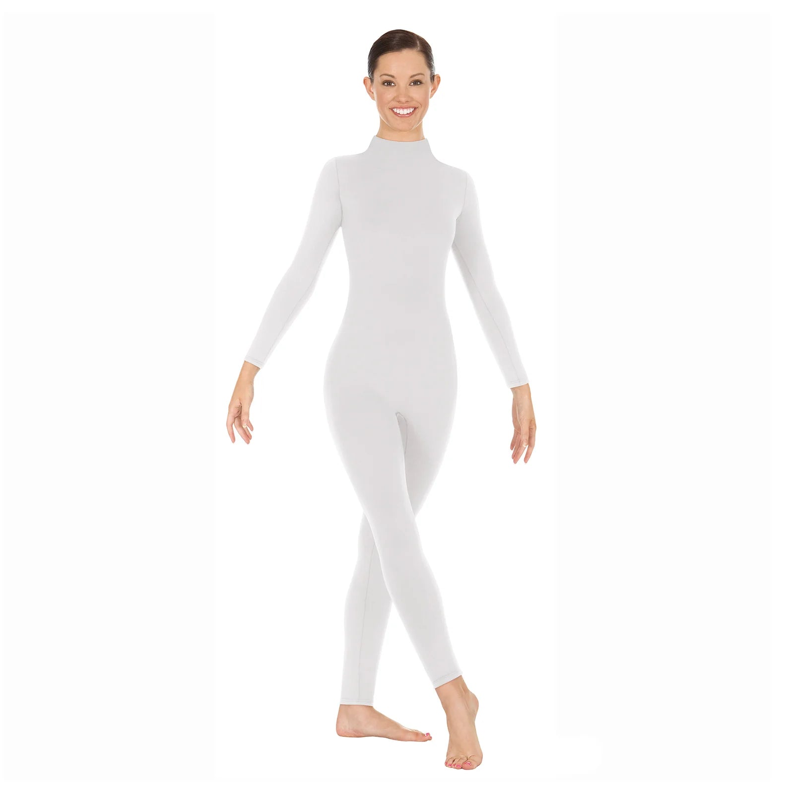 These Adult long sleeve, mock neck unitards by BalTogs are footless and feature a back center seam zipper. White bodysuit can be dyed to color of your choice. Unitard is unlined. Do not bleach. Hang dry or lay flat to dry.