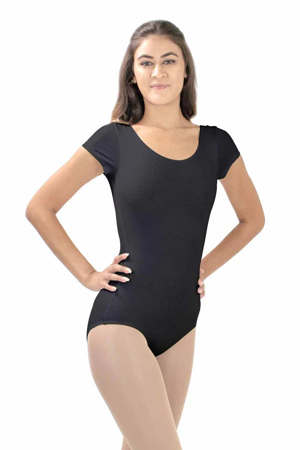 This classic short sleeve leotard makes an essential and practical piece in every dancer’s wardrobe. Featuring an elegant scoop neckline and a cotton blend material for quality and comfort. Feel great doing all your leaps and turns in this ultra classic short sleeve leotard.